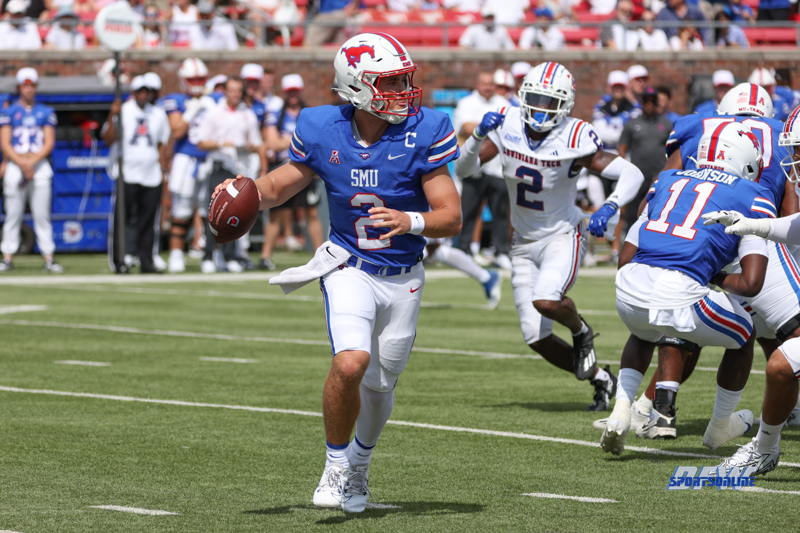 DALLAS, TX - SEPTEMBER 02: Southern Methodist Mustangs quarterback Preston Stone (2) rolls out during the game between SMU and Louisiana Tech on September 2, 2023 at Gerald J Ford Stadium in Dallas, TX. (Photo by George Walker/Icon Sportswire)