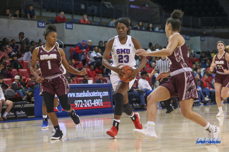 DALLAS, TX - NOVEMBER 09: Southern Methodist Mustangs forward BriShonne Tollie (23) drives to the basket during the game between SMU and ULM on November 9, 2018 at Moody Coliseum in Dallas, TX. (Photo by George Walker/DFWsportsonline)
