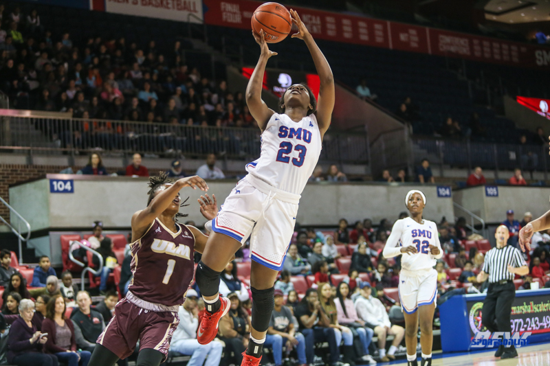 DALLAS, TX - NOVEMBER 09: Southern Methodist Mustangs forward BriShonne Tollie (23) goes to the basket during the game between SMU and ULM on November 9, 2018 at Moody Coliseum in Dallas, TX. (Photo by George Walker/DFWsportsonline)