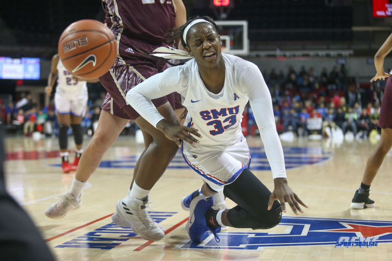 DALLAS, TX - NOVEMBER 09: Southern Methodist Mustangs forward Johnasia Cash (33) is fouled during the game between SMU and ULM on November 9, 2018 at Moody Coliseum in Dallas, TX. (Photo by George Walker/DFWsportsonline)