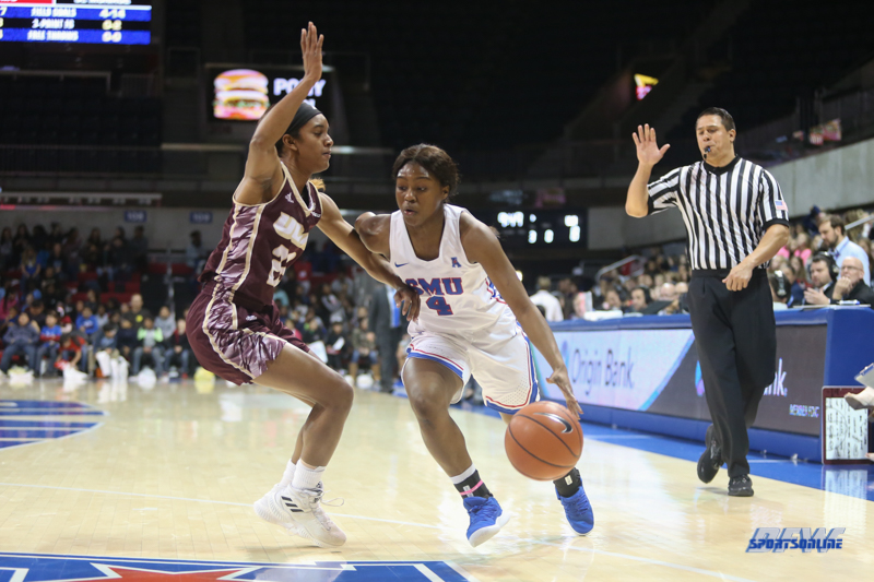 DALLAS, TX - NOVEMBER 09: Southern Methodist Mustangs guard Amber Bacon (4) drives to the basket during the game between SMU and ULM on November 9, 2018 at Moody Coliseum in Dallas, TX. (Photo by George Walker/DFWsportsonline)