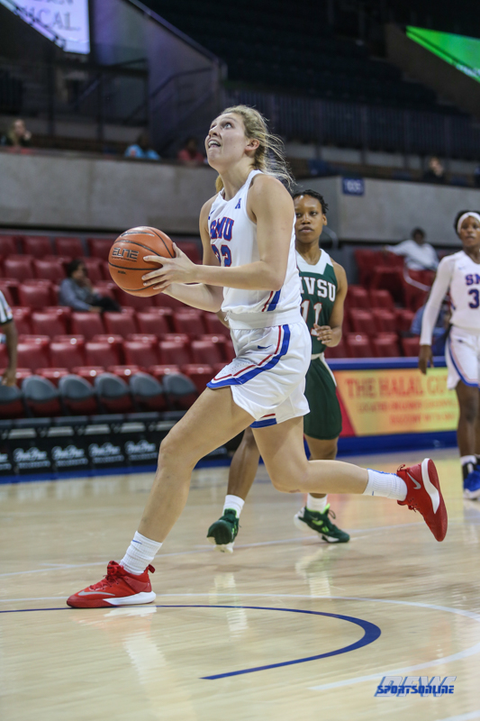 DALLAS, TX - NOVEMBER 12: Southern Methodist Mustangs forward Marie Olson (22) goes to the basket during the game between SMU and Mississippi Valley State on November 12, 2018 at Moody Coliseum in Dallas, TX. (Photo by George Walker/DFWsportsonline)