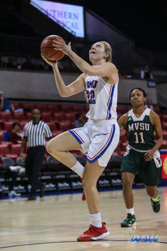 DALLAS, TX - NOVEMBER 12: Southern Methodist Mustangs forward Marie Olson (22) goes to the basket during the game between SMU and Mississippi Valley State on November 12, 2018 at Moody Coliseum in Dallas, TX. (Photo by George Walker/DFWsportsonline)