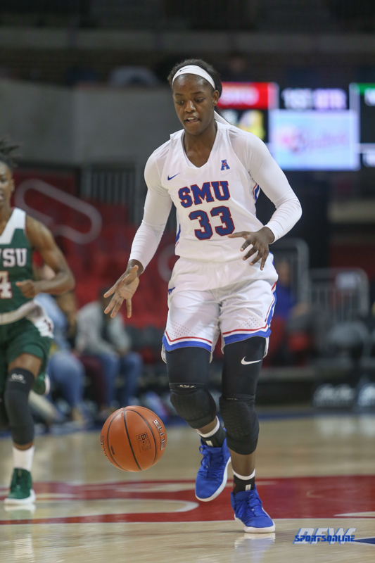 DALLAS, TX - NOVEMBER 12: Southern Methodist Mustangs forward Johnasia Cash (33) brings the ball up court during the game between SMU and Mississippi Valley State on November 12, 2018 at Moody Coliseum in Dallas, TX. (Photo by George Walker/DFWsportsonline)