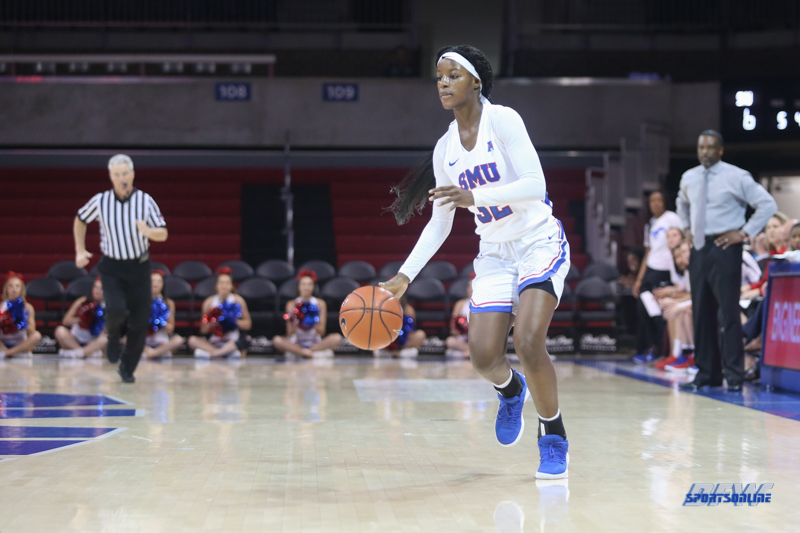 DALLAS, TX - NOVEMBER 12: Southern Methodist Mustangs guard Kayla White (32) brings the ball up court during the game between SMU and Mississippi Valley State on November 12, 2018 at Moody Coliseum in Dallas, TX. (Photo by George Walker/Icon Sportswire)