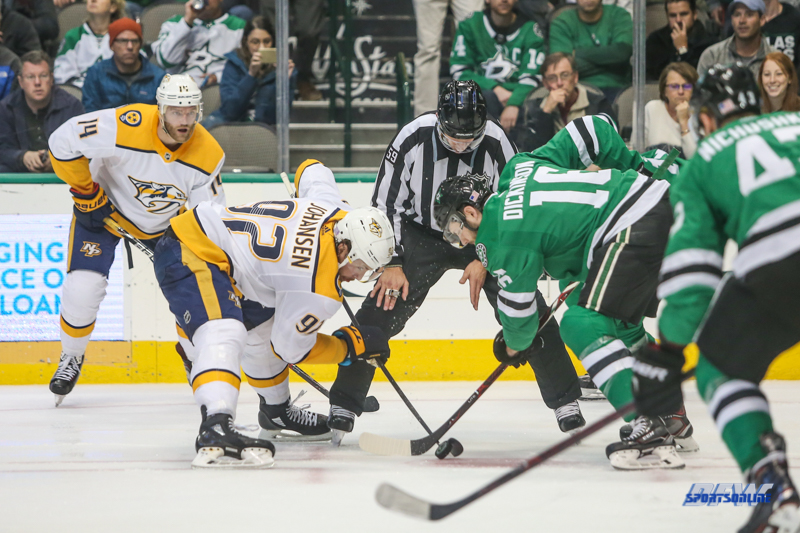 NOVEMBER 10: Face-off during the game between the Dallas Stars and Nashville Predators on November 10, 2018 at the American Airlines Center in Dallas, TX. (Photo by George Walker/DFWsportsonline)