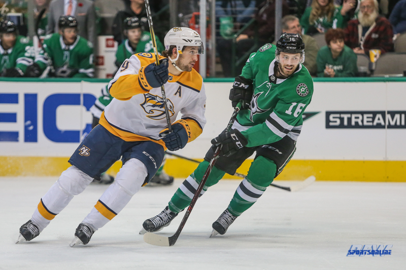 NOVEMBER 10: Nashville Predators Left Wing Filip Forsberg (9) and Dallas Stars Center Jason Dickinson (16) during the game between the Dallas Stars and Nashville Predators on November 10, 2018 at the American Airlines Center in Dallas, TX. (Photo by George Walker/DFWsportsonline)