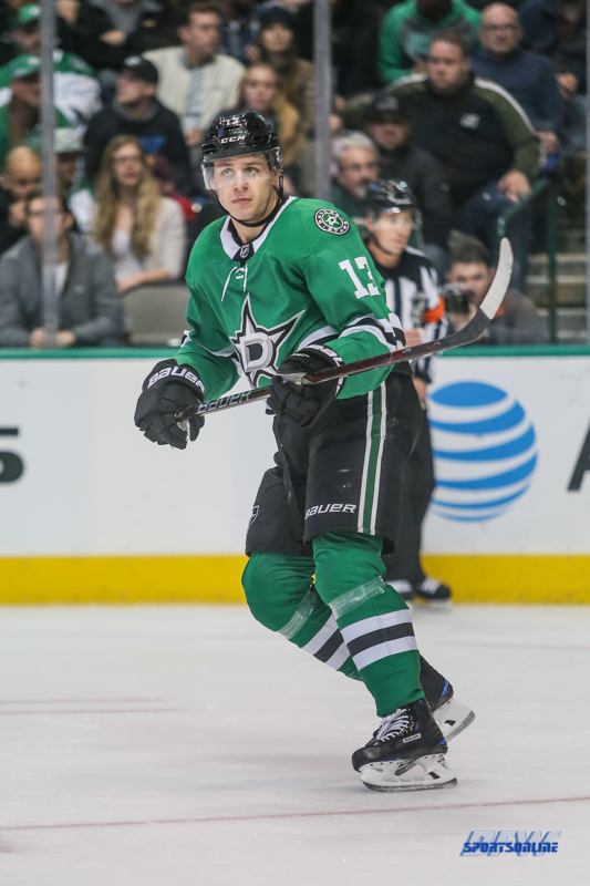 NOVEMBER 10: Dallas Stars Winger Mattias Janmark (13) during the game between the Dallas Stars and Nashville Predators on November 10, 2018 at the American Airlines Center in Dallas, TX. (Photo by George Walker/DFWsportsonline)