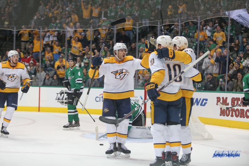 NOVEMBER 10: Nashville Predators celebrate a goal during the game between the Dallas Stars and Nashville Predators on November 10, 2018 at the American Airlines Center in Dallas, TX. (Photo by George Walker/DFWsportsonline)