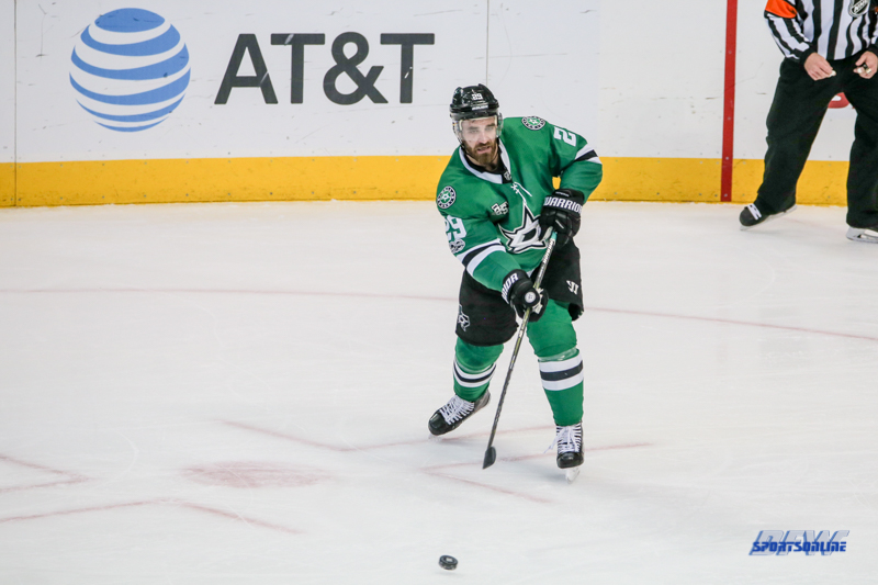 DALLAS, TX - DECEMBER 09: Dallas Stars Defenceman Greg Pateryn (29) passes the puck during the game between the Dallas Stars and Vegas Golden Knights on December 9, 2017 at the American Airlines Center in Dallas, TX. (Photo by George Walker/Icon Sportswire)
