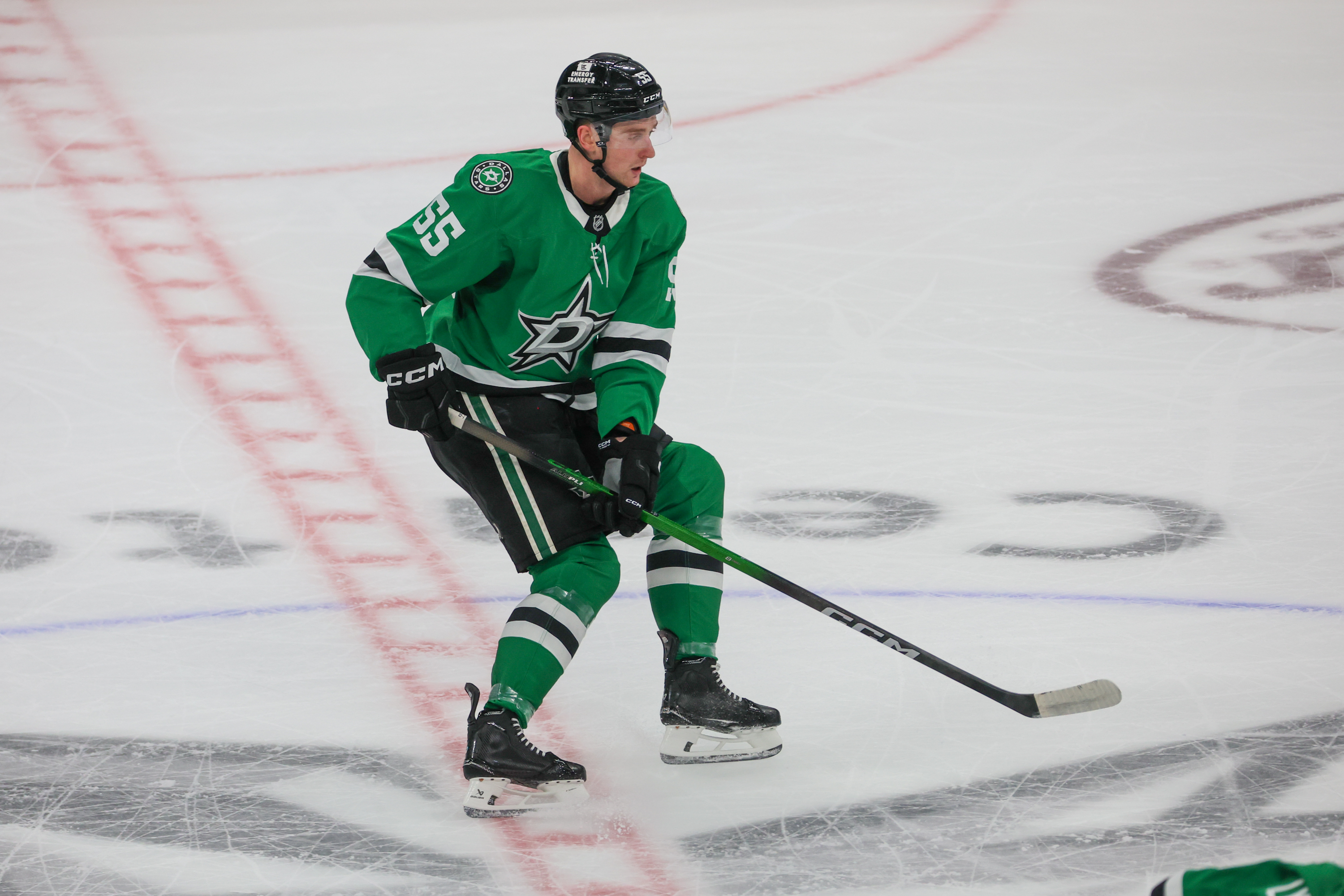DALLAS, TX - APR 21: Dallas Stars defenseman Thomas Harley (55) during the Round 1 Game 2 of the 2025 Stanley Cup Playoffs game between the Dallas Stars and the Colorado Avalanche on April 21, 2025 at the American Airlines Center in Dallas, TX. (Photo by George Walker/DFWsportsonline)