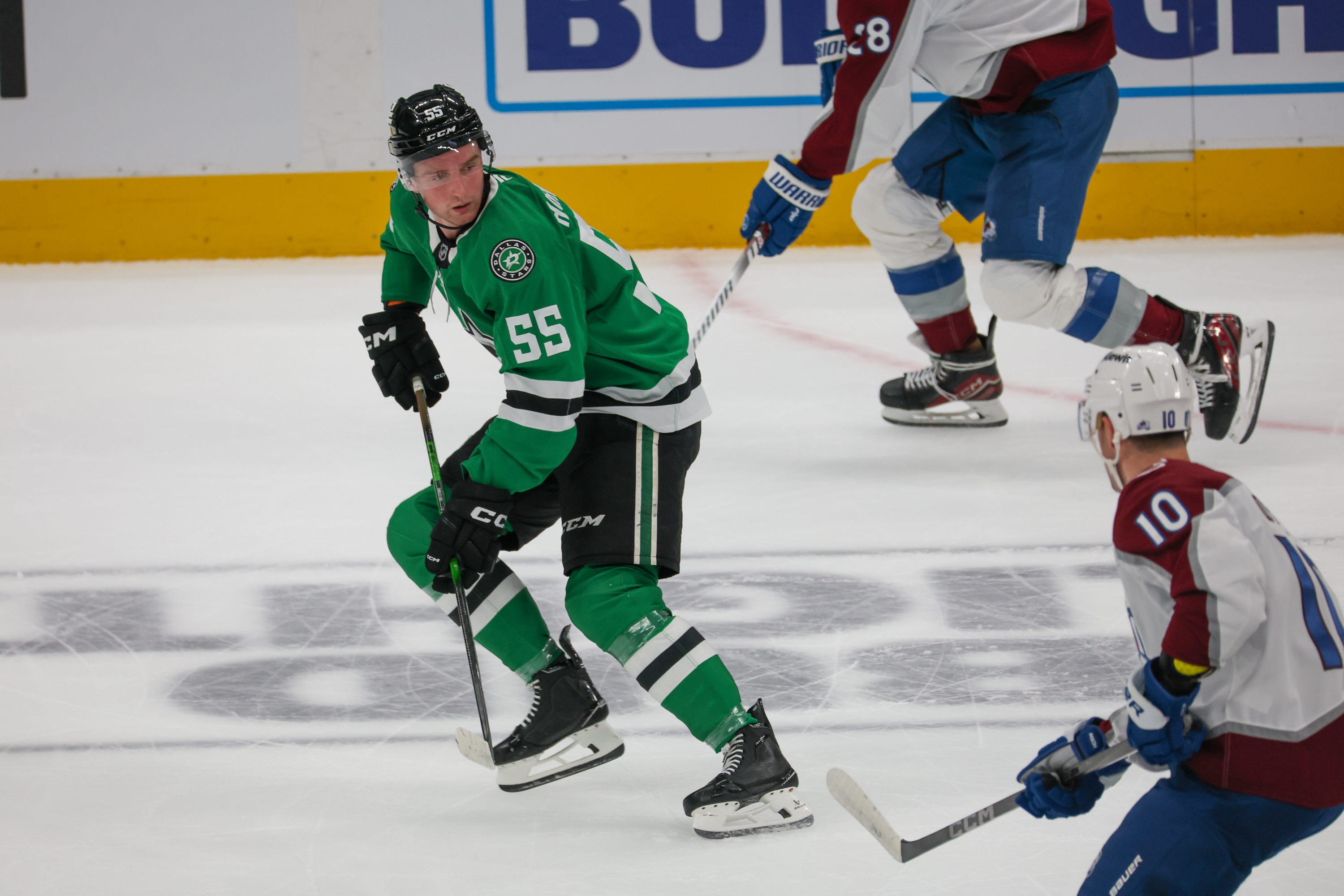 DALLAS, TX - APR 21: Dallas Stars defenseman Thomas Harley (55) during the Round 1 Game 2 of the 2025 Stanley Cup Playoffs game between the Dallas Stars and the Colorado Avalanche on April 21, 2025 at the American Airlines Center in Dallas, TX. (Photo by George Walker/DFWsportsonline)