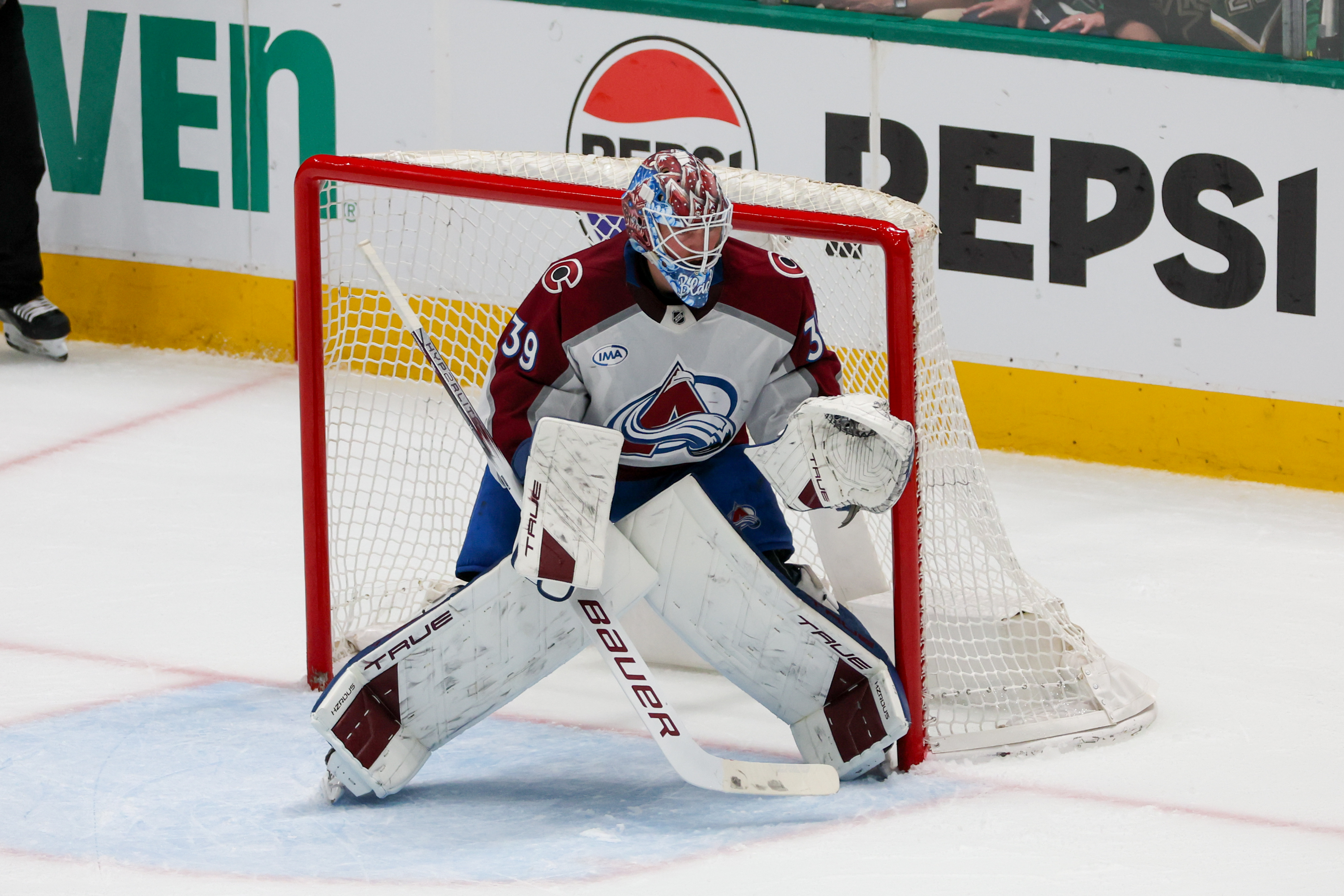 DALLAS, TX - APR 21: Colorado Avalanche goaltender Mackenzie Blackwood (39) minds the net during the Round 1 Game 2 of the 2025 Stanley Cup Playoffs game between the Dallas Stars and the Colorado Avalanche on April 21, 2025 at the American Airlines Center in Dallas, TX. (Photo by George Walker/DFWsportsonline)