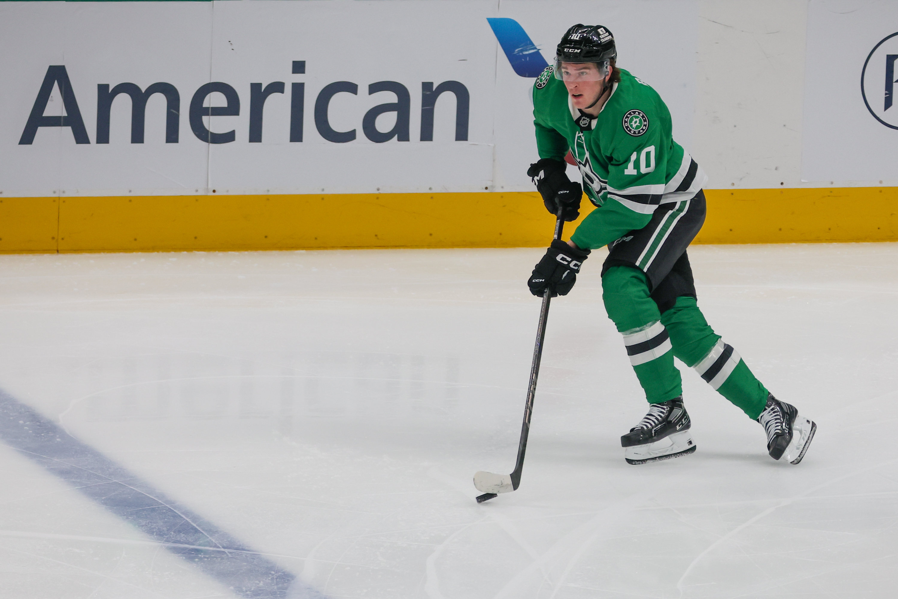 DALLAS, TX - APR 21: Dallas Stars center Oskar Bäck (10) moves the puck during the Round 1 Game 2 of the 2025 Stanley Cup Playoffs game between the Dallas Stars and the Colorado Avalanche on April 21, 2025 at the American Airlines Center in Dallas, TX. (Photo by George Walker/DFWsportsonline)