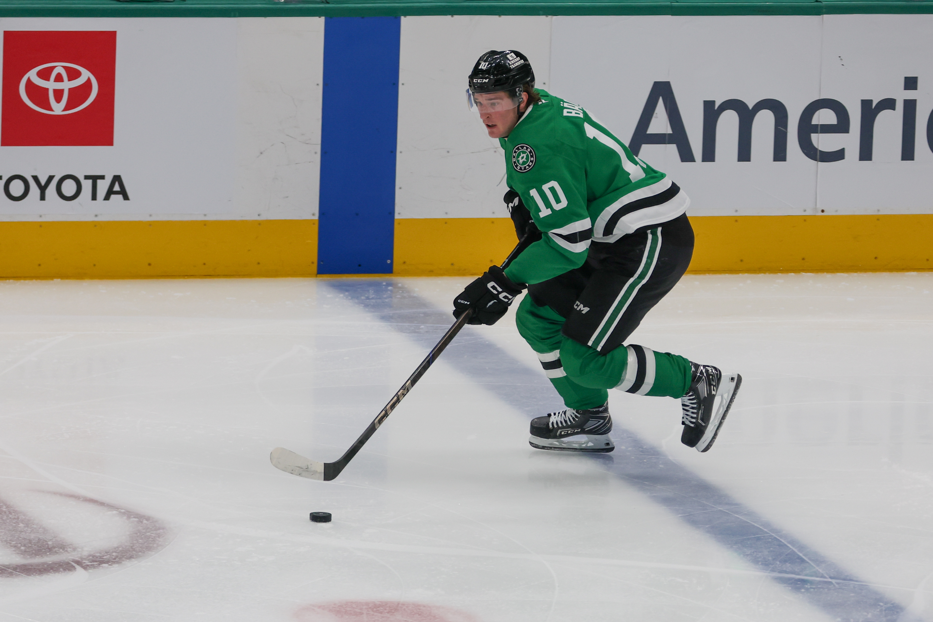 DALLAS, TX - APR 21: Dallas Stars center Oskar Bäck (10) moves the puck during the Round 1 Game 2 of the 2025 Stanley Cup Playoffs game between the Dallas Stars and the Colorado Avalanche on April 21, 2025 at the American Airlines Center in Dallas, TX. (Photo by George Walker/DFWsportsonline)