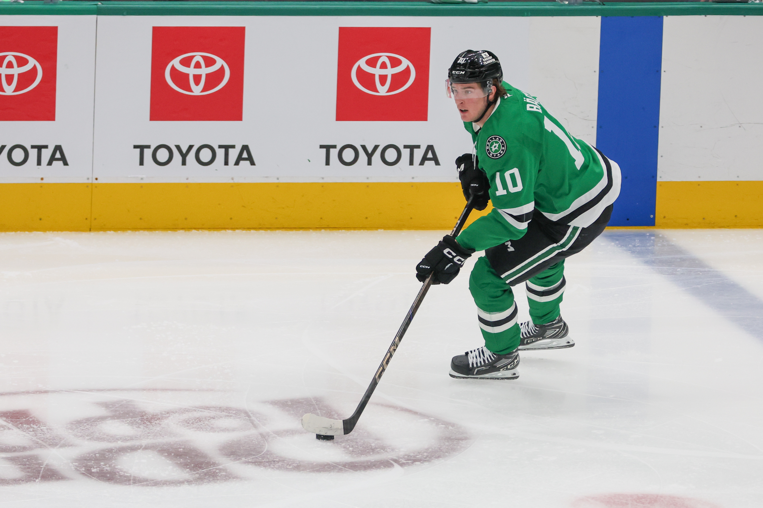 DALLAS, TX - APR 21: Dallas Stars center Oskar Bäck (10) moves the puck during the Round 1 Game 2 of the 2025 Stanley Cup Playoffs game between the Dallas Stars and the Colorado Avalanche on April 21, 2025 at the American Airlines Center in Dallas, TX. (Photo by George Walker/DFWsportsonline)