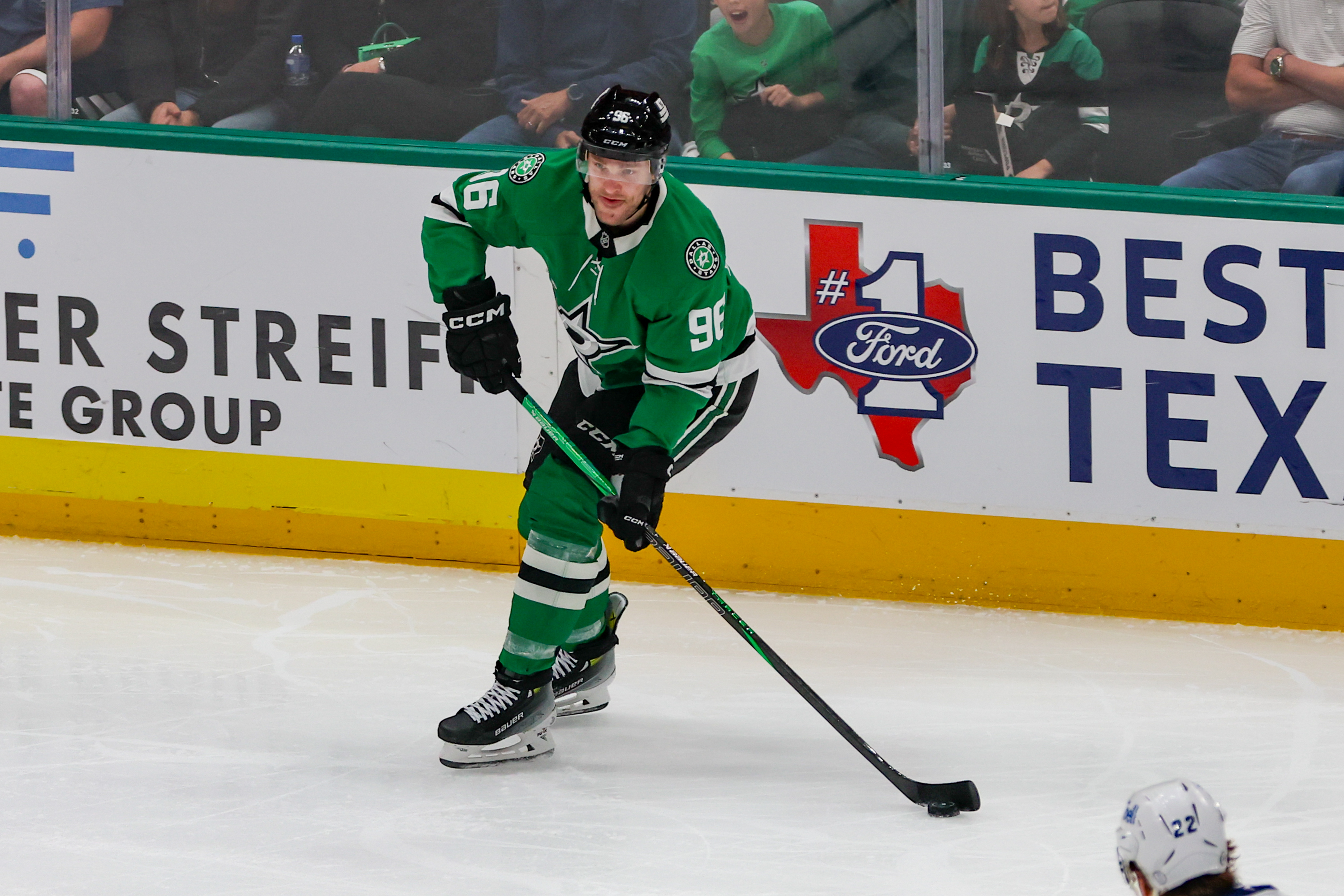 DALLAS, TX - APR 10: Dallas Stars right wing Mikko Rantanen (96) moves the puck during the game between the Dallas Stars and the Winnipeg Jets on April 10, 2025 at the American Airlines Center in Dallas, TX. (Photo by George Walker/DFWsportsonline)