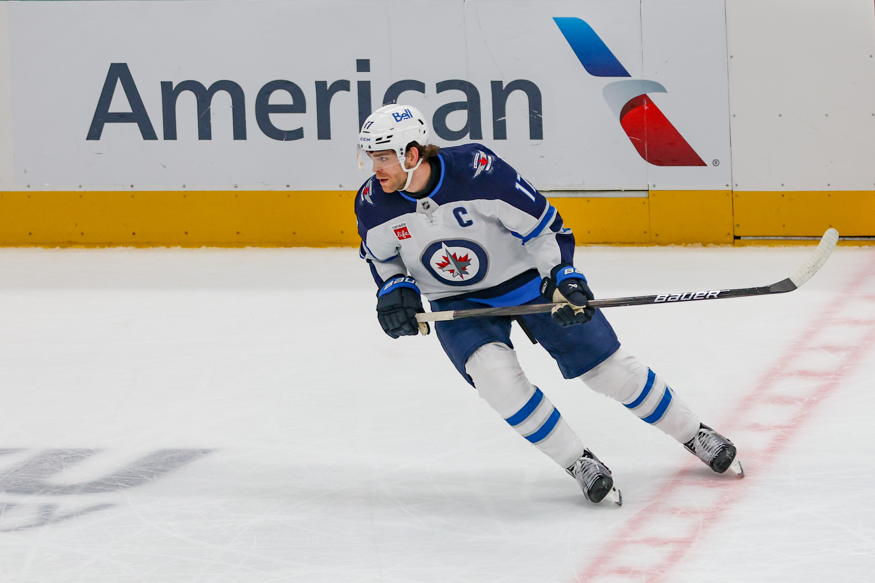 DALLAS, TX - APR 10: Winnipeg Jets center Adam Lowry (17) skates during the game between the Dallas Stars and the Winnipeg Jets on April 10, 2025 at the American Airlines Center in Dallas, TX. (Photo by George Walker/DFWsportsonline)