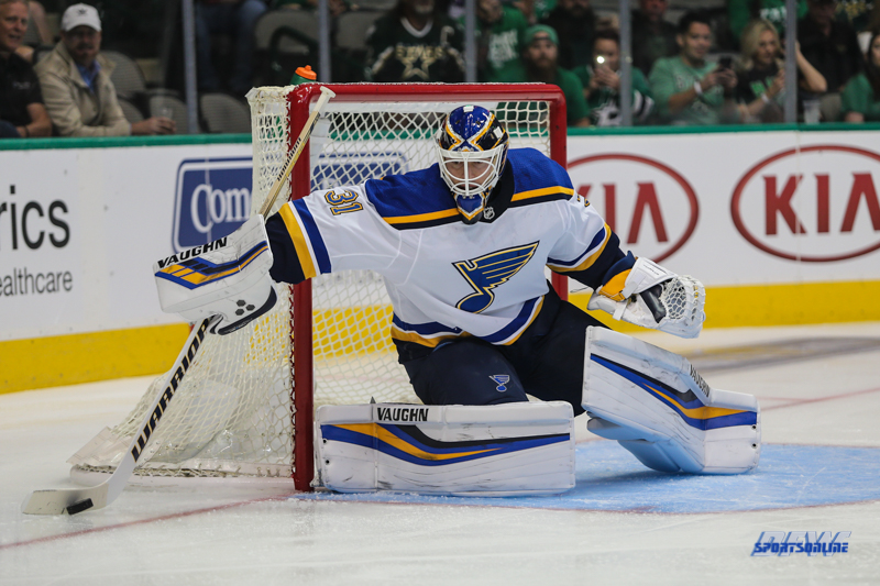 SEPTEMBER 18, 2018: St. Louis Blues goaltender Chad Johnson (31) makes a stop during the game between the Dallas Stars and St. Louis Blues on September 18, 2018, at the American Airlines Center in Dallas, TX. (Photo by George Walker/DFWsportsonline)