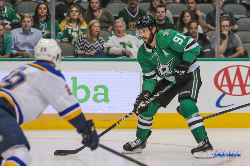 SEPTEMBER 18, 2018: Dallas Stars center Tyler Seguin (91) moves the puck during the game between the Dallas Stars and St. Louis Blues on September 18, 2018, at the American Airlines Center in Dallas, TX. (Photo by George Walker/DFWsportsonline)