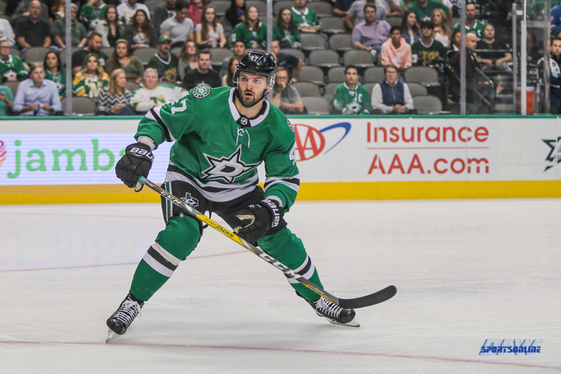 SEPTEMBER 18, 2018: Dallas Stars right wing Alexander Radulov (47) watches the puck during the game between the Dallas Stars and St. Louis Blues on September 18, 2018, at the American Airlines Center in Dallas, TX. (Photo by George Walker/DFWsportsonline)