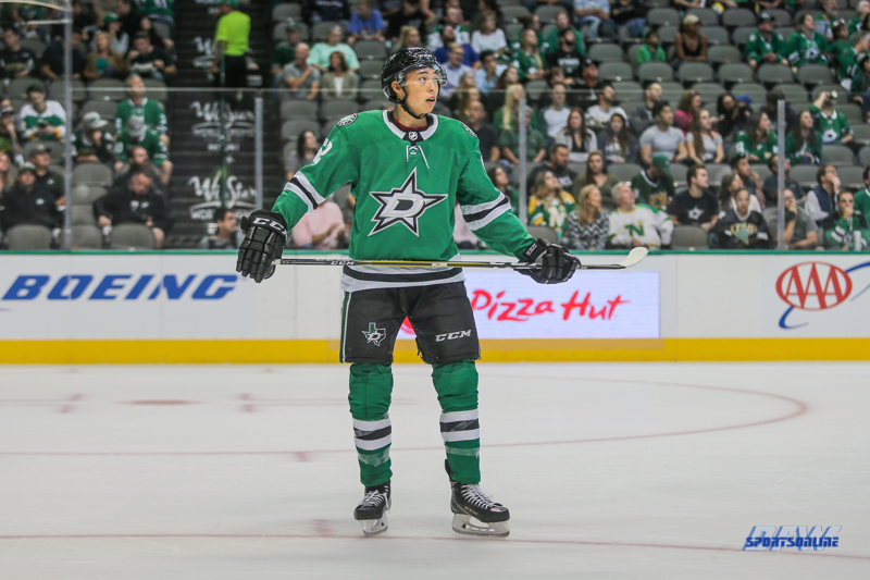 SEPTEMBER 18, 2018: Dallas Stars left wing Jason Robertson skates during the game between the Dallas Stars and St. Louis Blues on September 18, 2018, at the American Airlines Center in Dallas, TX. (Photo by George Walker/DFWsportsonline)