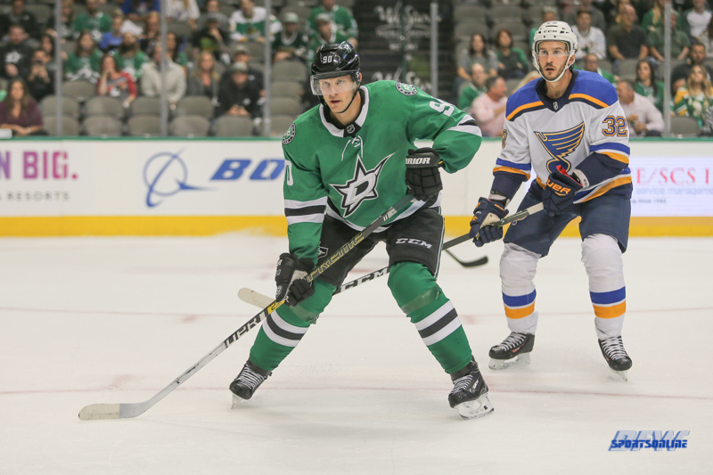 SEPTEMBER 18, 2018: Dallas Stars center Jason Spezza (90) and St. Louis Blues center Brian Flynn (32) watch the puck during the game between the Dallas Stars and St. Louis Blues on September 18, 2018, at the American Airlines Center in Dallas, TX. (Photo by George Walker/DFWsportsonline)