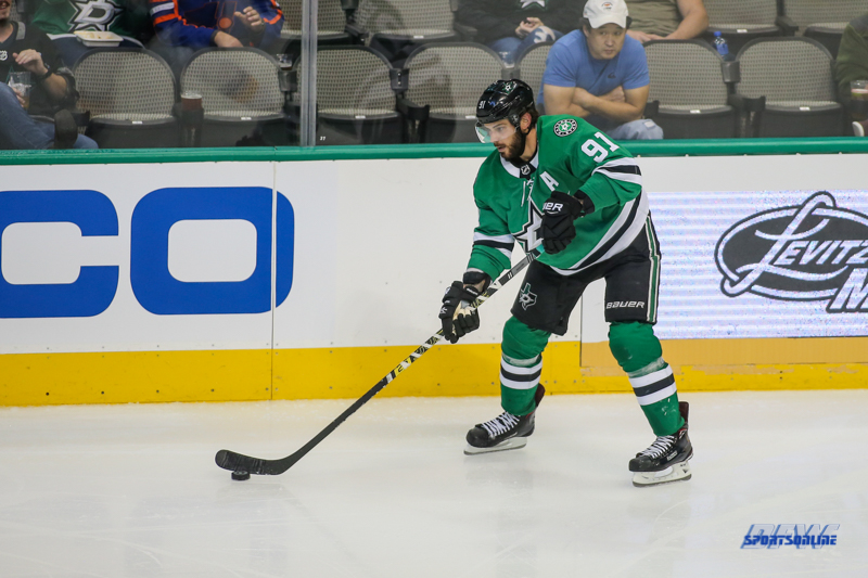 SEPTEMBER 18, 2018: Dallas Stars center Tyler Seguin (91) moves the puck during the game between the Dallas Stars and St. Louis Blues on September 18, 2018, at the American Airlines Center in Dallas, TX. (Photo by George Walker/DFWsportsonline)