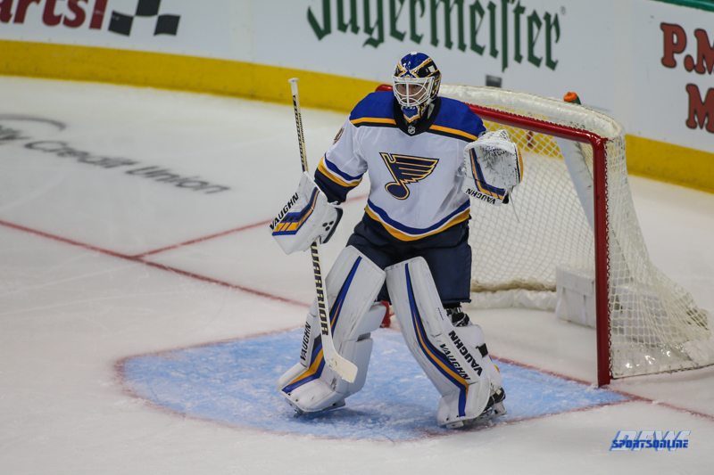 SEPTEMBER 18, 2018: St. Louis Blues goaltender Chad Johnson (31) stands at the goal during the game between the Dallas Stars and St. Louis Blues on September 18, 2018, at the American Airlines Center in Dallas, TX. (Photo by George Walker/DFWsportsonline)