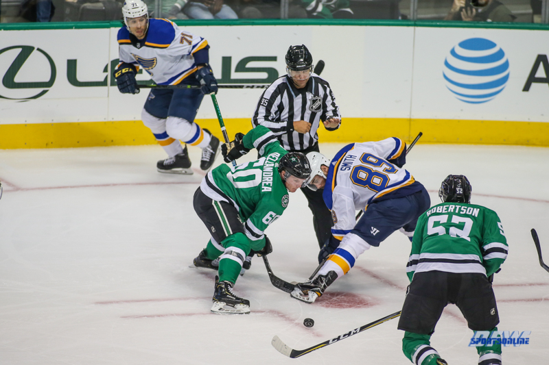 SEPTEMBER 18, 2018: Face-off during the game between the Dallas Stars and St. Louis Blues on September 18, 2018, at the American Airlines Center in Dallas, TX. (Photo by George Walker/DFWsportsonline)