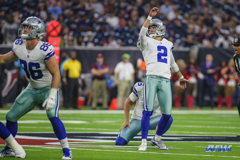 HOUSTON, TX - AUGUST 30: Dallas Cowboys kicker Brett Maher (2) kicks a field goal during the preseason game between the Houston Texans and Dallas Cowboys on August 30, 2018, at NRG Stadium in Houston, TX. (Photo by George Walker/DFWsportsonline)