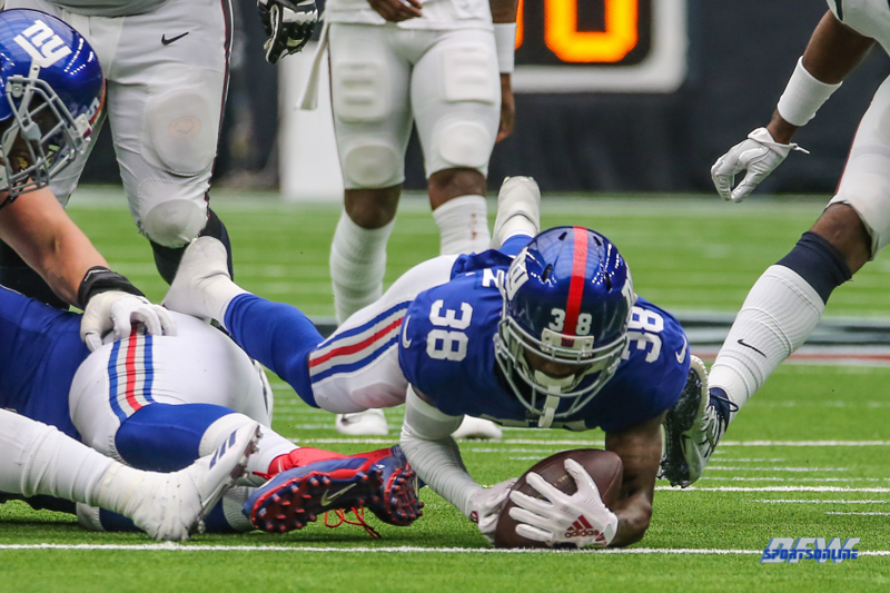 HOUSTON, TX - SEPTEMBER 23: New York Giants cornerback Donte' Deayon (38) dives to recover a fumble during the game between the Houston Texans and New York Giants on September 23, 2018, at NRG Stadium in Houston, TX. (Photo by George Walker/DFWsportsonline)