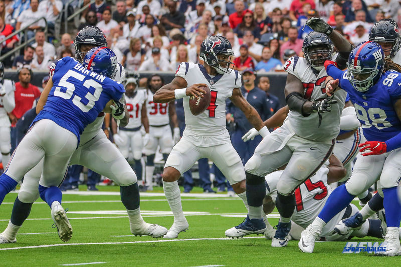 HOUSTON, TX - SEPTEMBER 23: Houston Texans quarterback Deshaun Watson (4) passes during the game between the Houston Texans and New York Giants on September 23, 2018, at NRG Stadium in Houston, TX. (Photo by George Walker/DFWsportsonline)