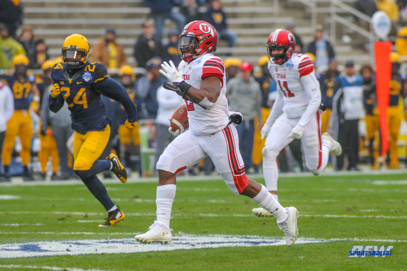 DALLAS, TX - DECEMBER 26: Utah Utes running back Zack Moss (2) runs to the end zone for a touchdown during the Zaxby's Heart of Dallas Bowl game between Utah and West Virginia on December 26, 2017, at Cotton Bowl Stadium in Dallas, TX. (Photo by George Walker/Icon Sportswire)