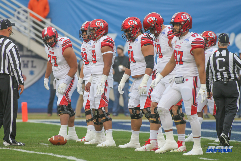 DALLAS, TX - DECEMBER 26: Utah Utes offensive line takes position during the Zaxby's Heart of Dallas Bowl game between Utah and West Virginia on December 26, 2017, at Cotton Bowl Stadium in Dallas, TX. (Photo by George Walker/Icon Sportswire)