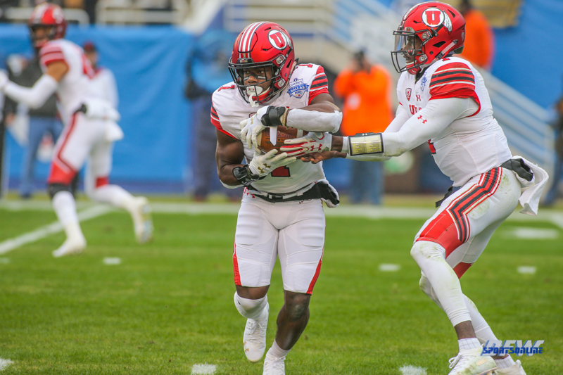DALLAS, TX - DECEMBER 26: Utah Utes running back Devonta'e Henry-Cole (7) takes a handoff from Utah Utes quarterback Tyler Huntley (1) during the Zaxby's Heart of Dallas Bowl game between Utah and West Virginia on December 26, 2017, at Cotton Bowl Stadium in Dallas, TX. (Photo by George Walker/Icon Sportswire)