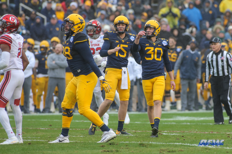DALLAS, TX - DECEMBER 26: West Virginia Mountaineers place kicker Evan Staley (30) kicks a field goal during the Zaxby's Heart of Dallas Bowl game between Utah and West Virginia on December 26, 2017, at Cotton Bowl Stadium in Dallas, TX. (Photo by George Walker/Icon Sportswire)