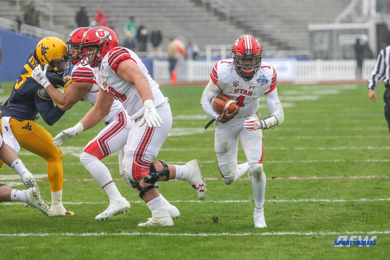 DALLAS, TX - DECEMBER 26: Utah Utes quarterback Tyler Huntley (1) runs toward the end zone during the Zaxby's Heart of Dallas Bowl game between Utah and West Virginia on December 26, 2017, at Cotton Bowl Stadium in Dallas, TX. (Photo by George Walker/Icon Sportswire)