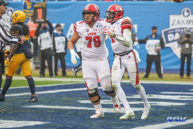 DALLAS, TX - DECEMBER 26: Utah Utes quarterback Tyler Huntley (1) celebrates a touchdown with Utah Utes offensive lineman Jordan Agasiva (79) during the Zaxby's Heart of Dallas Bowl game between Utah and West Virginia on December 26, 2017, at Cotton Bowl Stadium in Dallas, TX. (Photo by George Walker/Icon Sportswire)