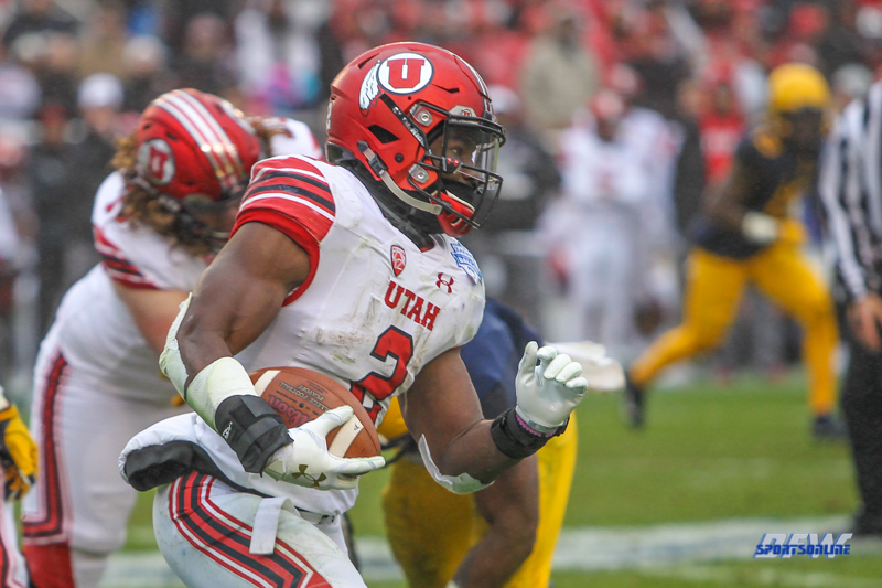 DALLAS, TX - DECEMBER 26: Utah Utes running back Zack Moss (2) cuts through the line during the Zaxby's Heart of Dallas Bowl game between Utah and West Virginia on December 26, 2017, at Cotton Bowl Stadium in Dallas, TX. (Photo by George Walker/Icon Sportswire)