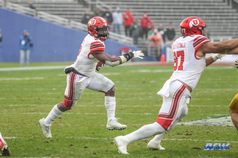 DALLAS, TX - DECEMBER 26: Utah Utes running back Zack Moss (2) looks for running room during the Zaxby's Heart of Dallas Bowl game between Utah and West Virginia on December 26, 2017, at Cotton Bowl Stadium in Dallas, TX. (Photo by George Walker/Icon Sportswire)