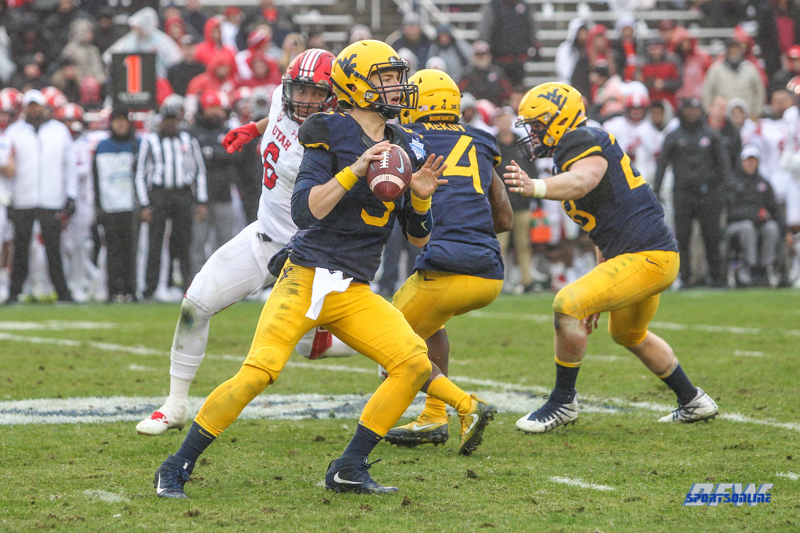 DALLAS, TX - DECEMBER 26: West Virginia Mountaineers quarterback Jack Allison (5) drops back to pass during the Zaxby's Heart of Dallas Bowl game between Utah and West Virginia on December 26, 2017, at Cotton Bowl Stadium in Dallas, TX. (Photo by George Walker/Icon Sportswire)